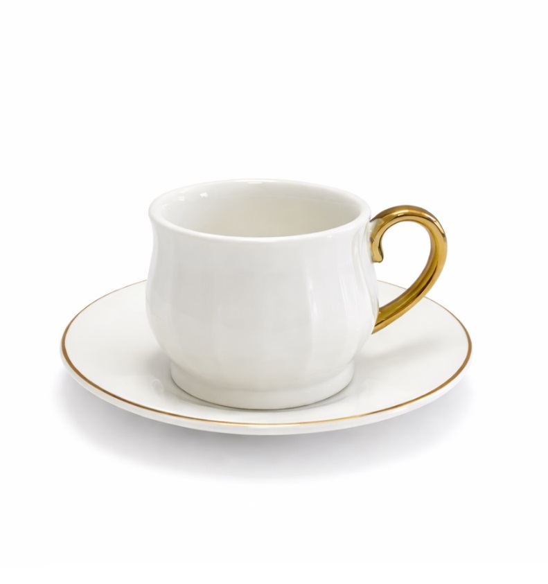 Prosta i elegancka filiżanka ceramiczna o pojemności 70 ml ze spodkiem do serwowania kawy po turecku lub espresso, wyróżniająca się subtelnym złotym akcentem na uchu. Ten detal nadaje całości wyjątkowego charakteru i doskonale komponuje się z klasyczną bielą ceramiki.