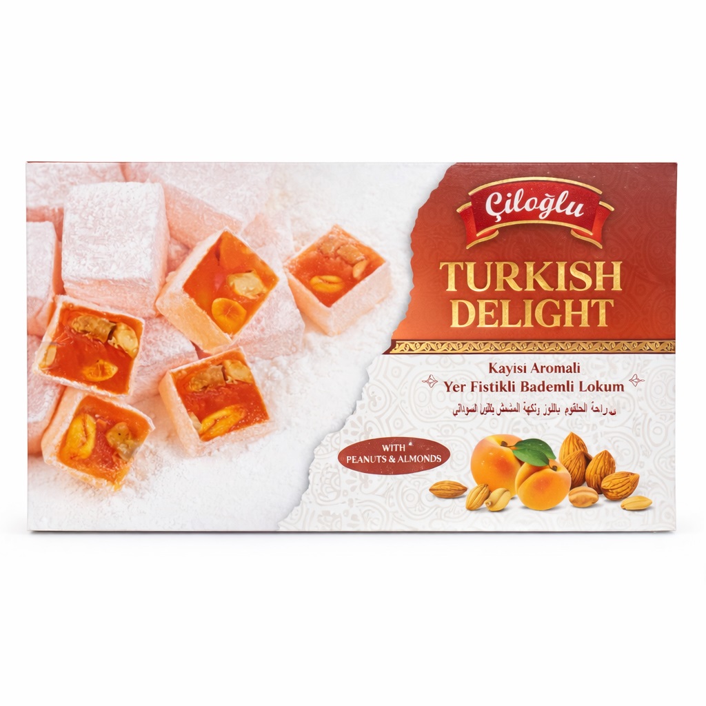 Kostki lokum zachwycają naturalnie słodkim smakiem z wyraźną, owocową nutą moreli, która nadaje słodyczy lekkości i przyjemnej świeżości. Dodatek orzeszków ziemnych i migdałów wzbogaca strukturę deseru o delikatną chrupkość oraz podkreśla głębię smaku. Całość jest delikatnie oprószona cukrem pudrem, co zapobiega sklejaniu i podkreśla tradycyjny charakter produktu.
